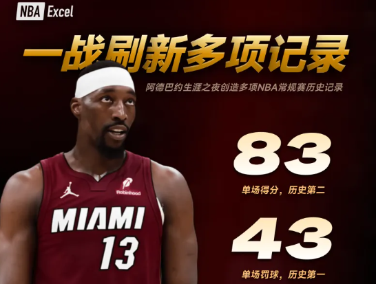 阿德巴约单节31分、半场43分、全场83分,三项全创队史新高