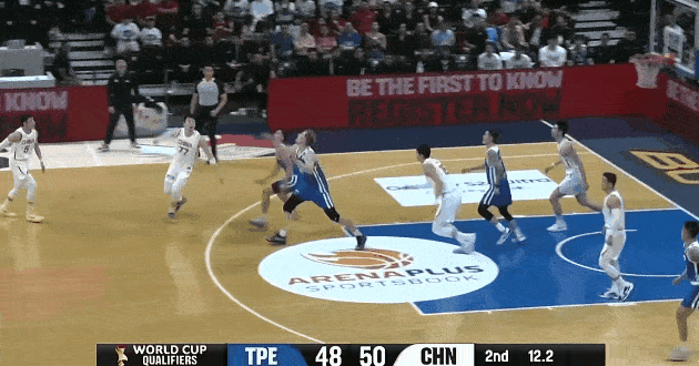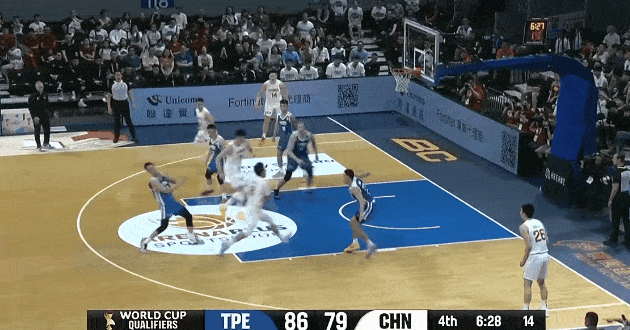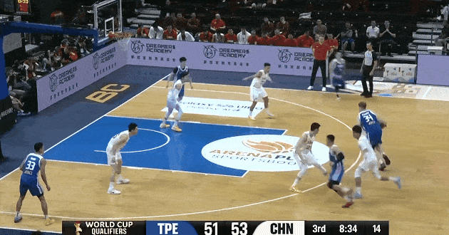 刘铮超远距离出手三分投进,中国男篮半场50-51落后中国台北