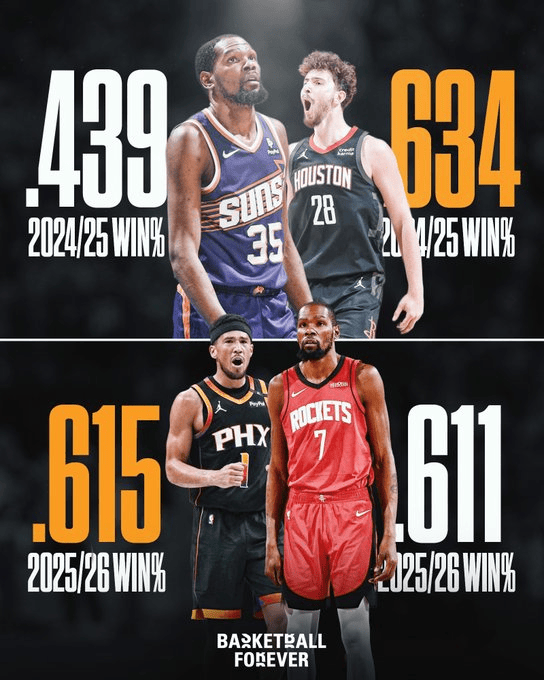 BF:太阳本赛季相较去年同期胜率提升17.6%,火箭则下降2.3%