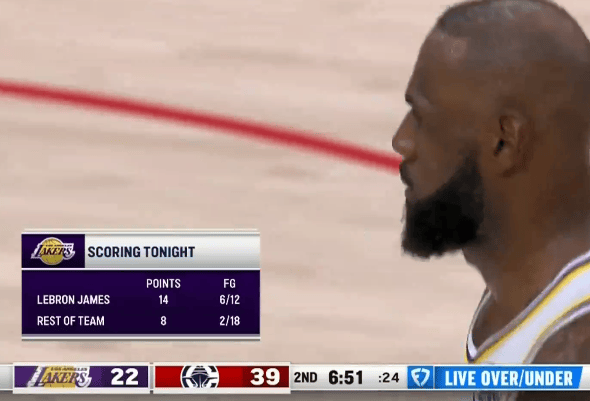 夸张对比!詹姆斯目前12中6得到14分,其余人18中2得到8分