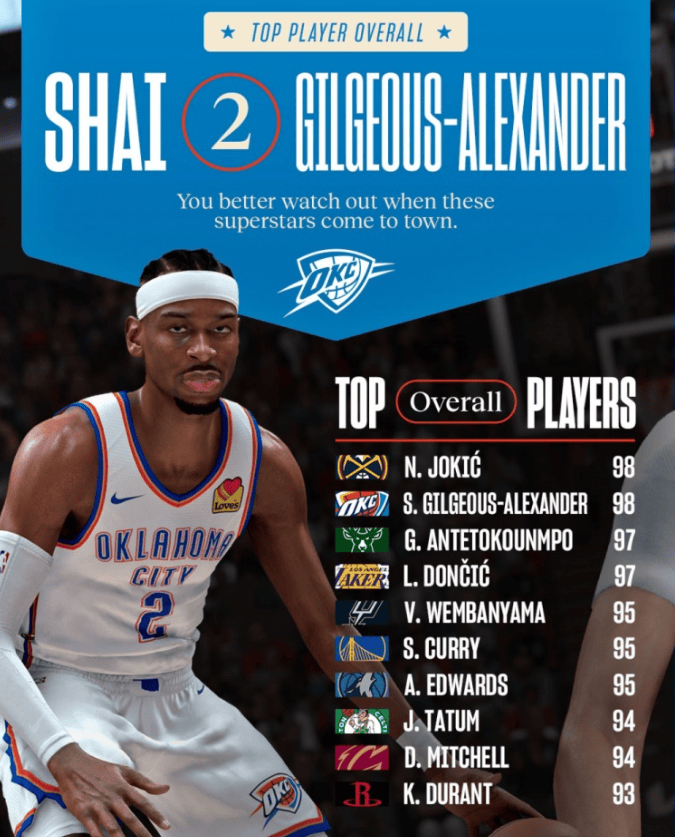 虎扑 6回复2K能力值前十:亚历山大&约基奇并列第1、字母哥&东契奇第2