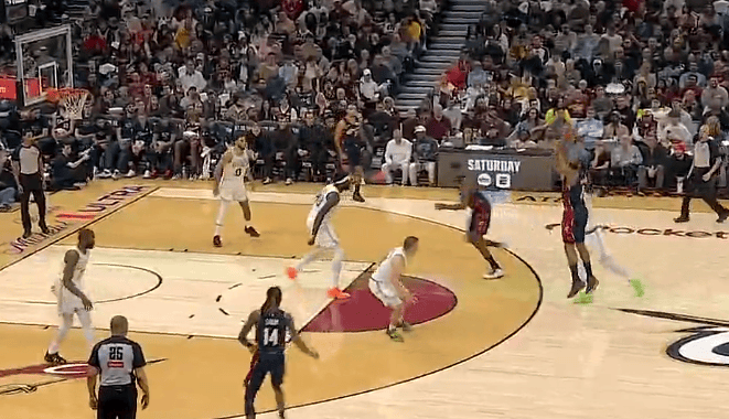 哈登弧顶借挡拆三分出手命中,开场两次出手命中连得5分