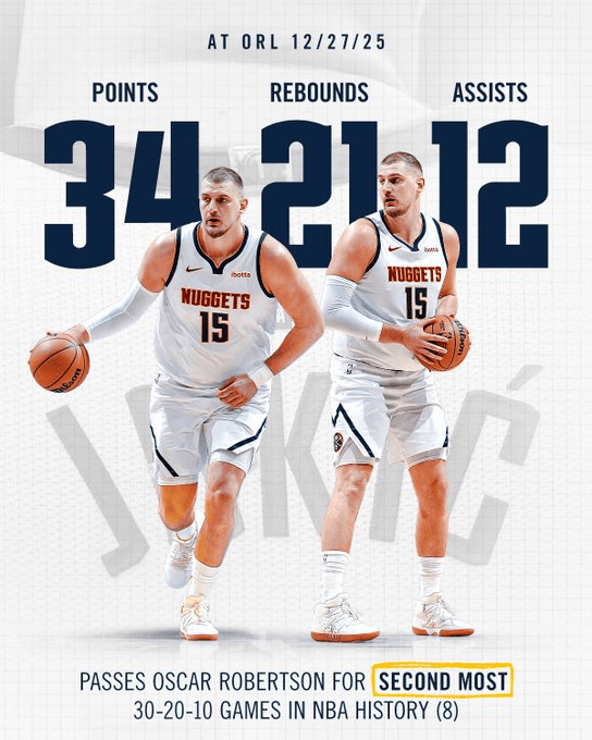 掘金官方:约基奇拥有历史第二多30分+20板+10助的比赛