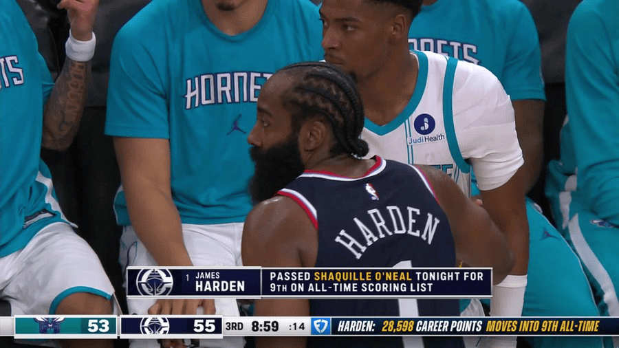 哈登攀升至历史得分榜第9,距离第8位张伯伦还差2836分