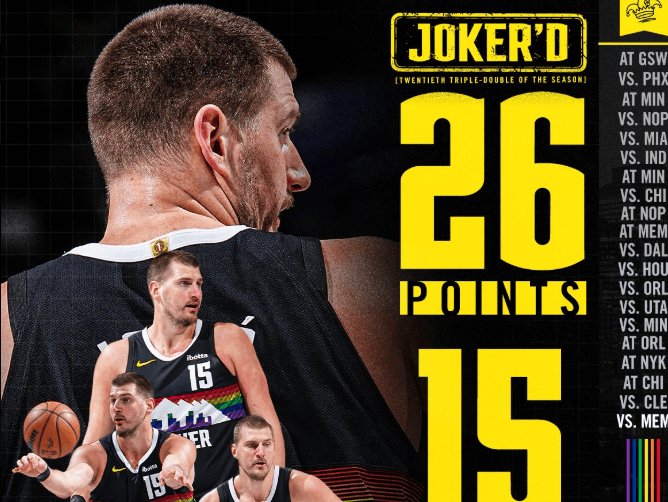 约基奇本赛季已20次砍下三双,连续4个赛季砍下20+次三双