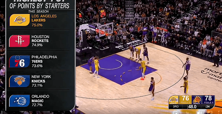 本赛季首发阵容得分占比:湖人75%联盟第一,火箭、76人二三