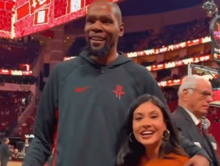 杜兰特场边认出昔日大学好友止不住笑容并上前合影