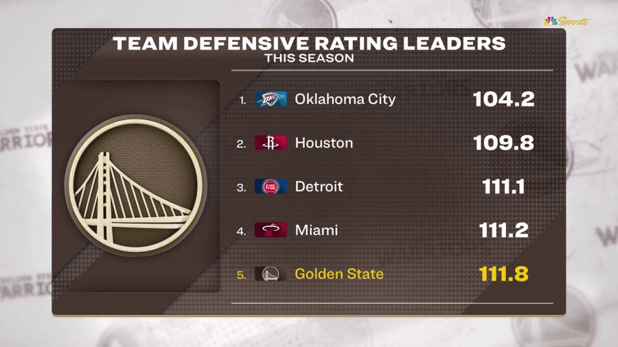 赛季至今防守效率值排行:雷霆、火箭、活塞、热火、勇士