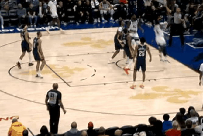 杰伦-威廉姆斯反击飞身上篮,遭格林从身后一把拉下犯规