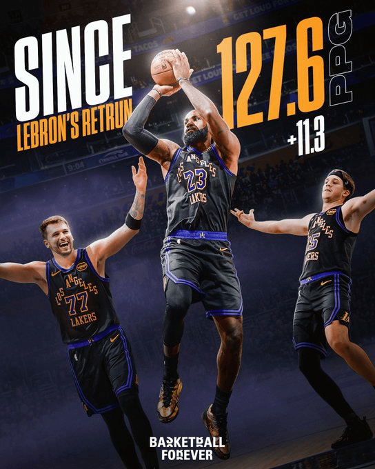 BF:自詹姆斯回归后,湖人场均得分从116.3分提升至127.6分