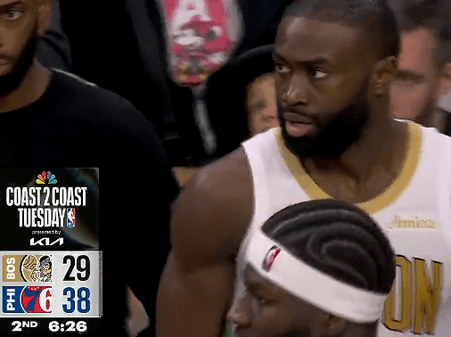 杰伦-布朗体前变向转身跳投终于命中,目前6中1得到5分