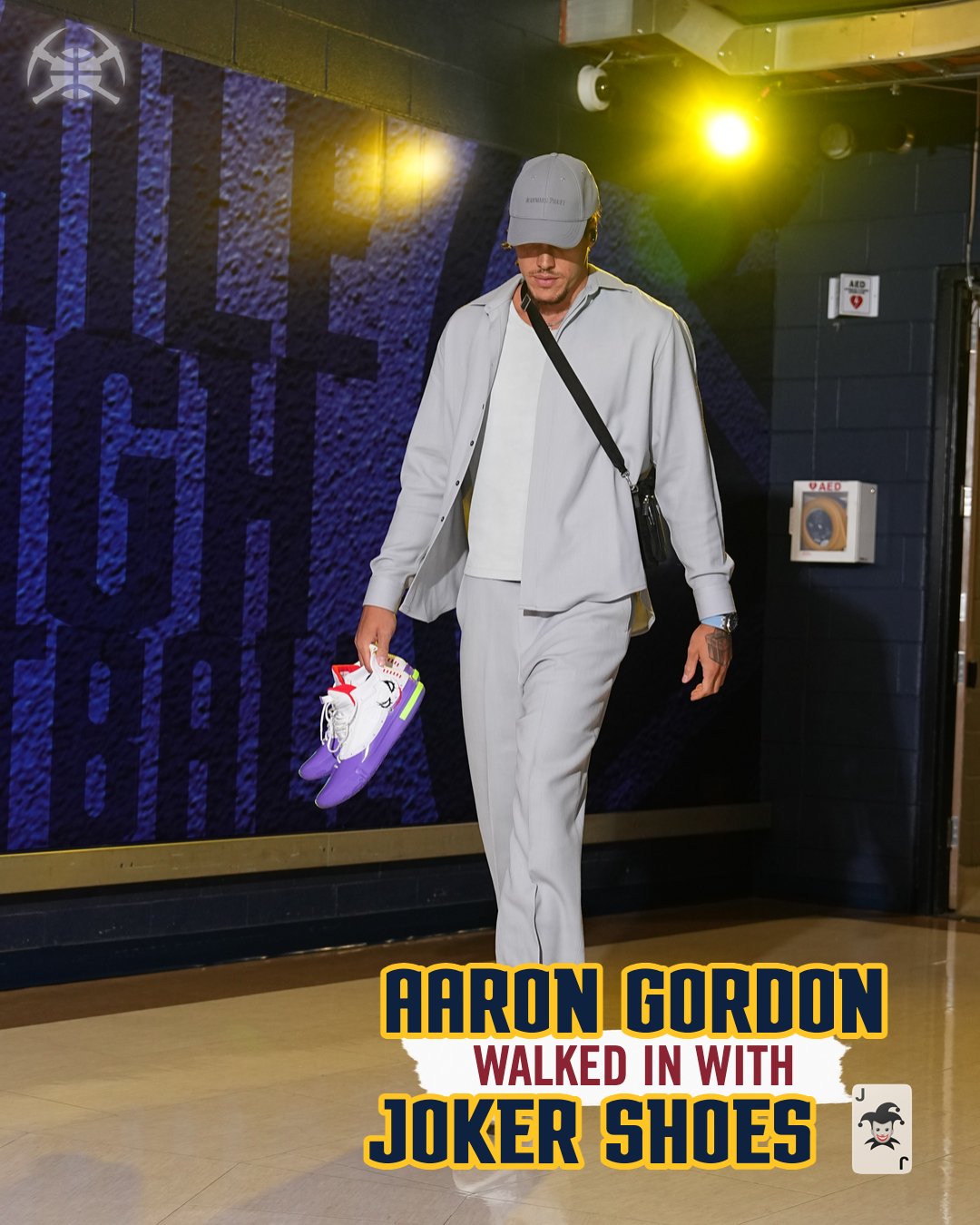 型男出镜!掘金社媒晒阿龙-戈登手持球鞋步入球馆的瞬间