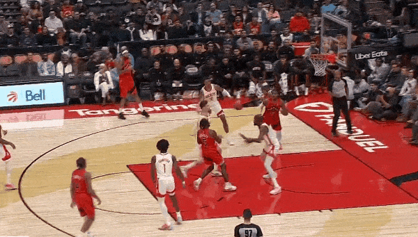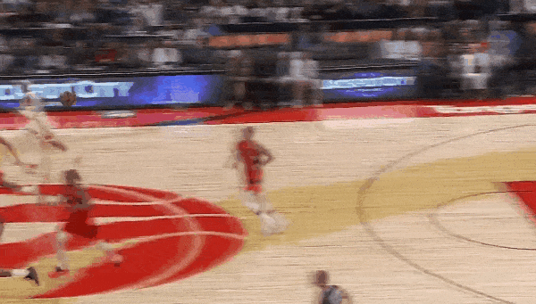 拉文体前变向甩开对手直捣黄龙,上演空中滑翔单臂暴扣