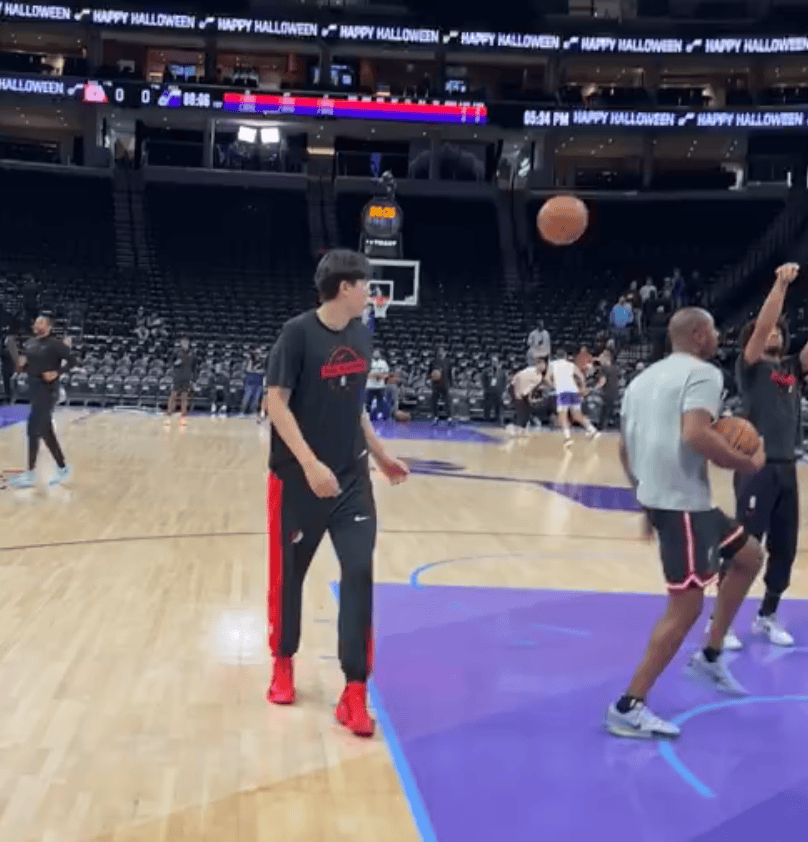 开拓者社媒分享杨瀚森热身片段:杨瀚森与夏普一起热身