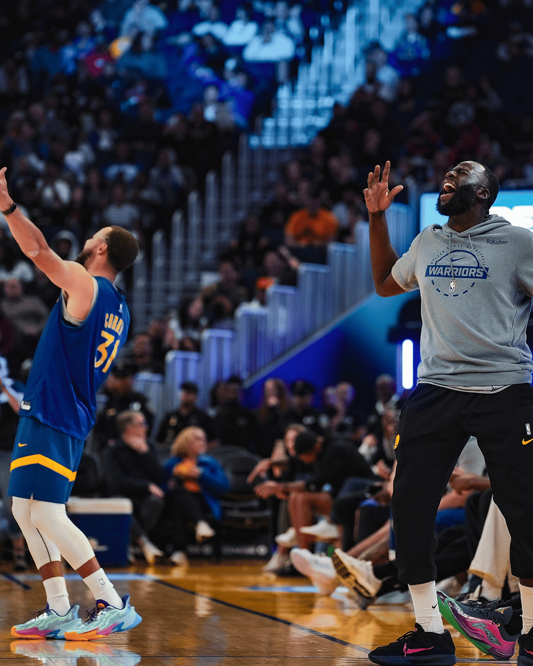 勇士官媒分享库里与格林的庆祝照:周末一定要愉快起来