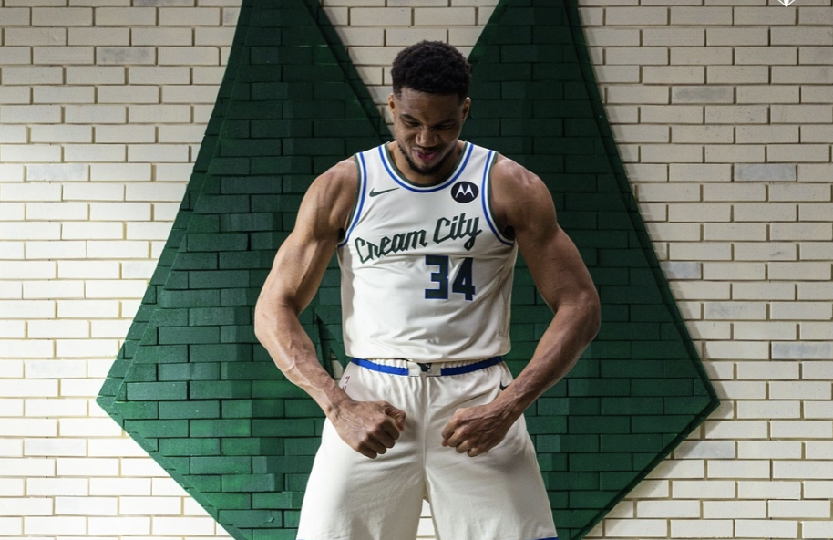 雄鹿官方分享阿德托昆博的定妆照:整洁的奶油色球衣