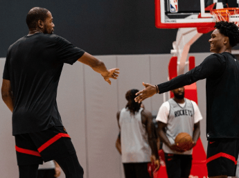 火箭社媒晒最新球员训练的组图,杜兰特与阿门击掌鼓励