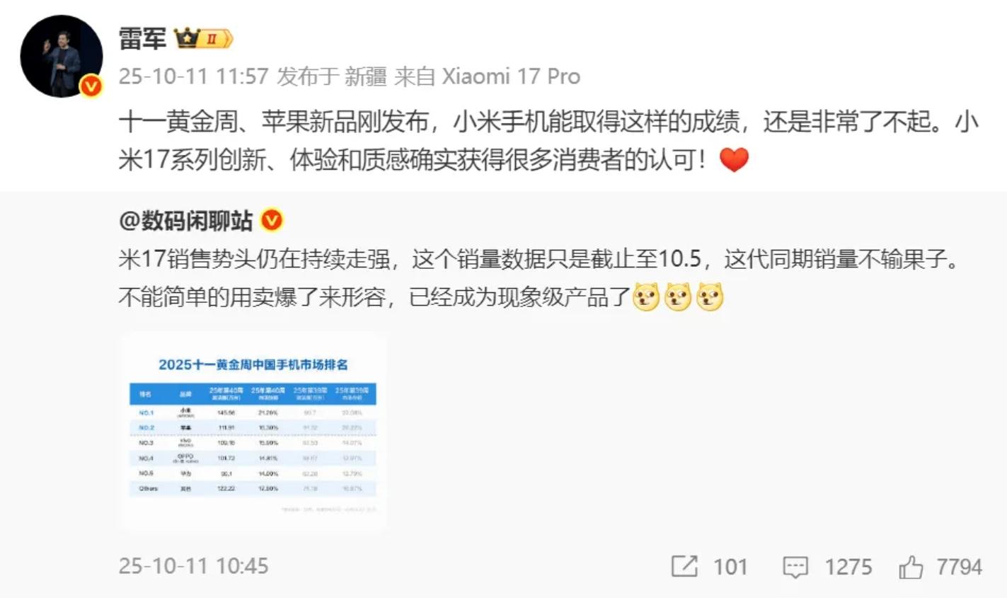 雷军回应小米17系列成绩:获得很多消费者认可