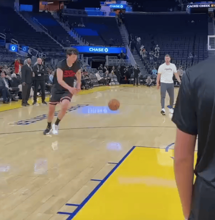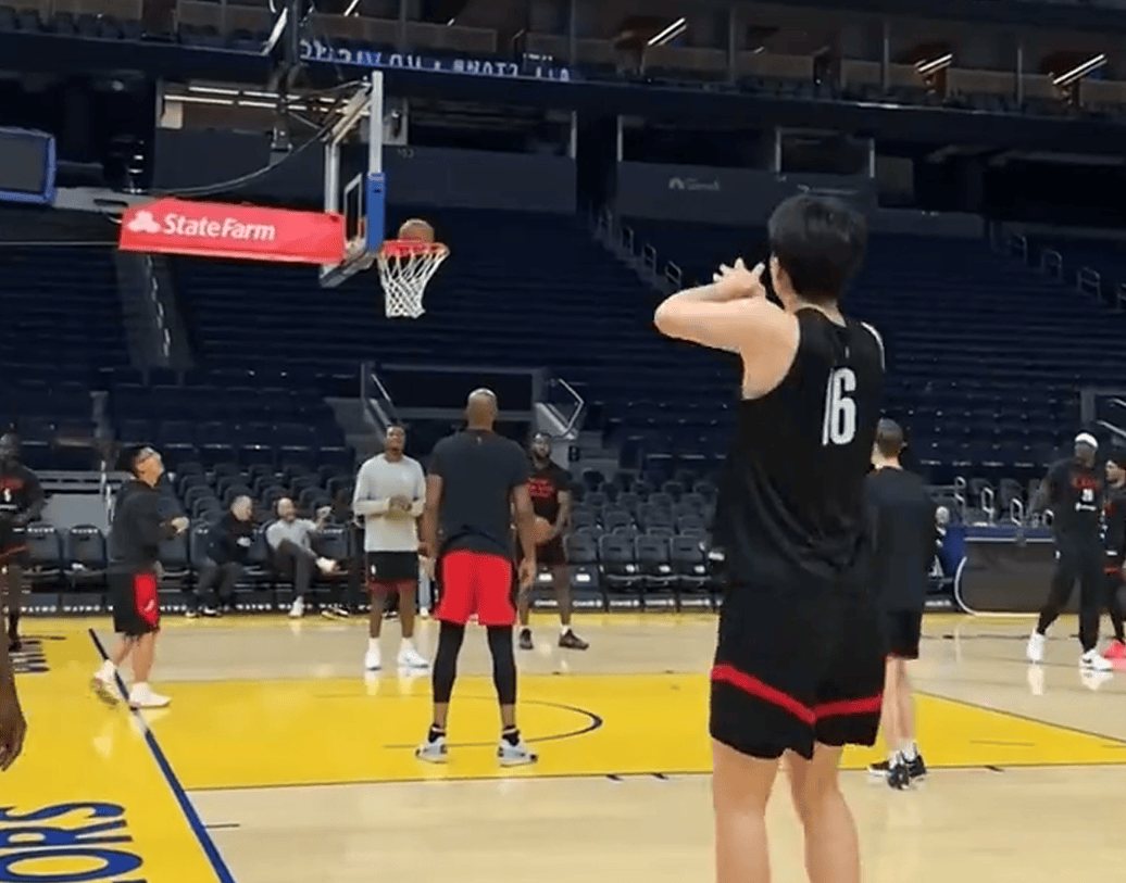 开拓者分享杨瀚森热身片段并配文:扣完那个,我再扣这个