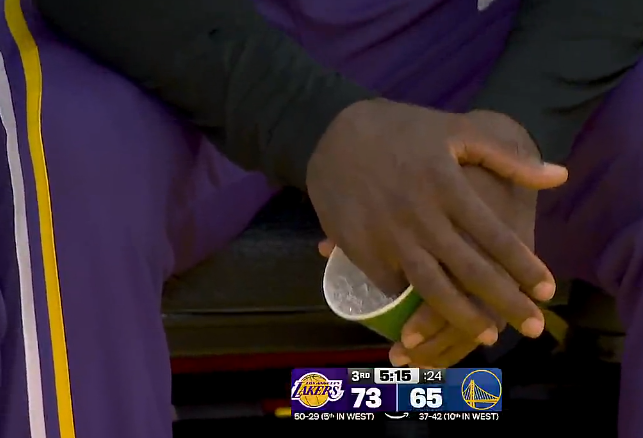 问题不大!詹姆斯拍篮板右手受伤,坐在替补席进行冰敷处理