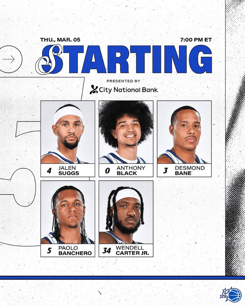 魔术首发:萨格斯、安东尼-布莱克、贝恩、班凯罗和小卡特