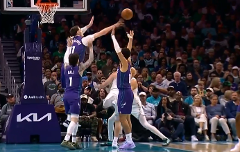 普里查德面对三人合围欲上篮,卡布送出遮天大帽将球扇飞