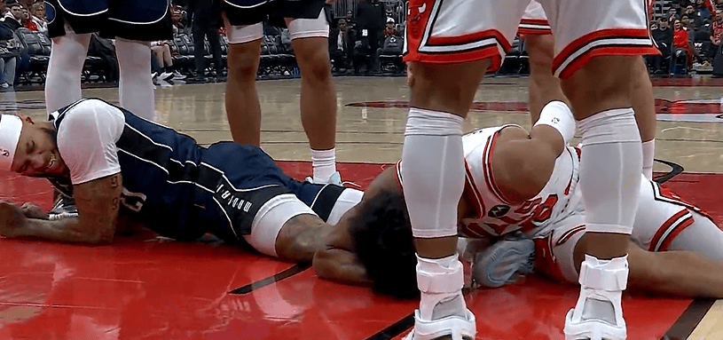 奥科罗抢板失衡倒地背部受伤,加福德被压到小腿受伤