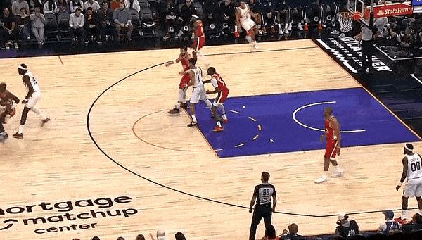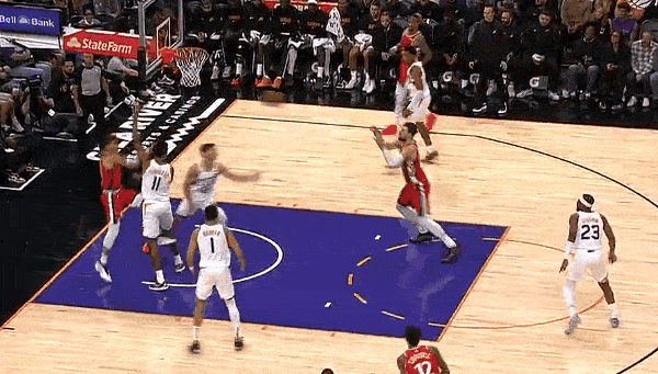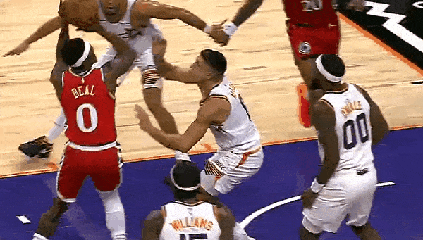 比尔后仰跳投遭阿伦迎面封盖,本场14中2&正负值-24