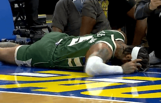 特伦特快攻上篮痛苦倒地小腿受伤,目前已被搀扶更衣室
