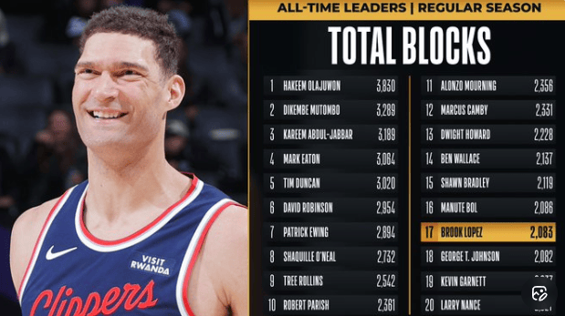 虎扑 25回复布鲁克-洛佩斯生涯盖帽数来到2083次,升至NBA历史第17位