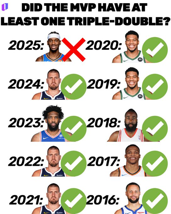 美媒:近10年来,SGA是唯一在MVP赛季中未曾达成三双的球员