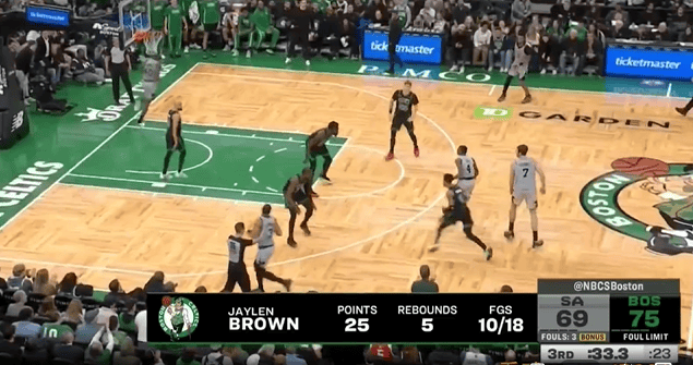 杰伦-布朗迎着卡斯尔拔中三分,三节砍下25分并怒吼庆祝