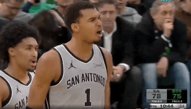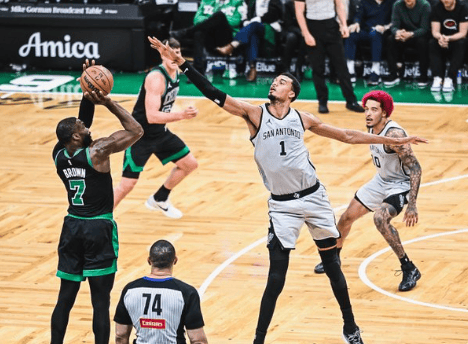 文班先大帽杰伦-布朗,随后反击大踏步完成暴扣打停凯尔特人