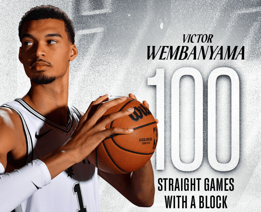 马刺官方:文班连续100场送出盖帽,队史最长&历史第三长