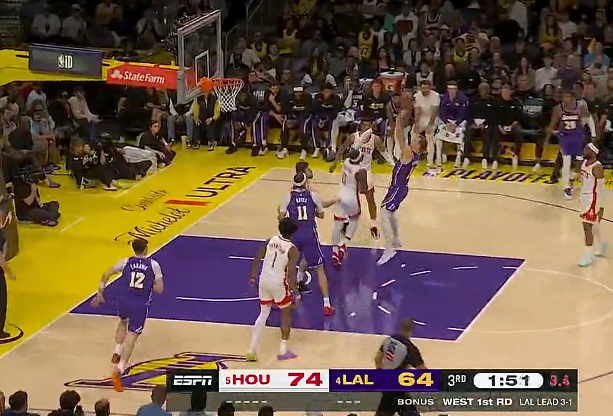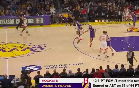 肯纳德吊传拉拉维亚上篮打进,湖人一波10-3追停火箭