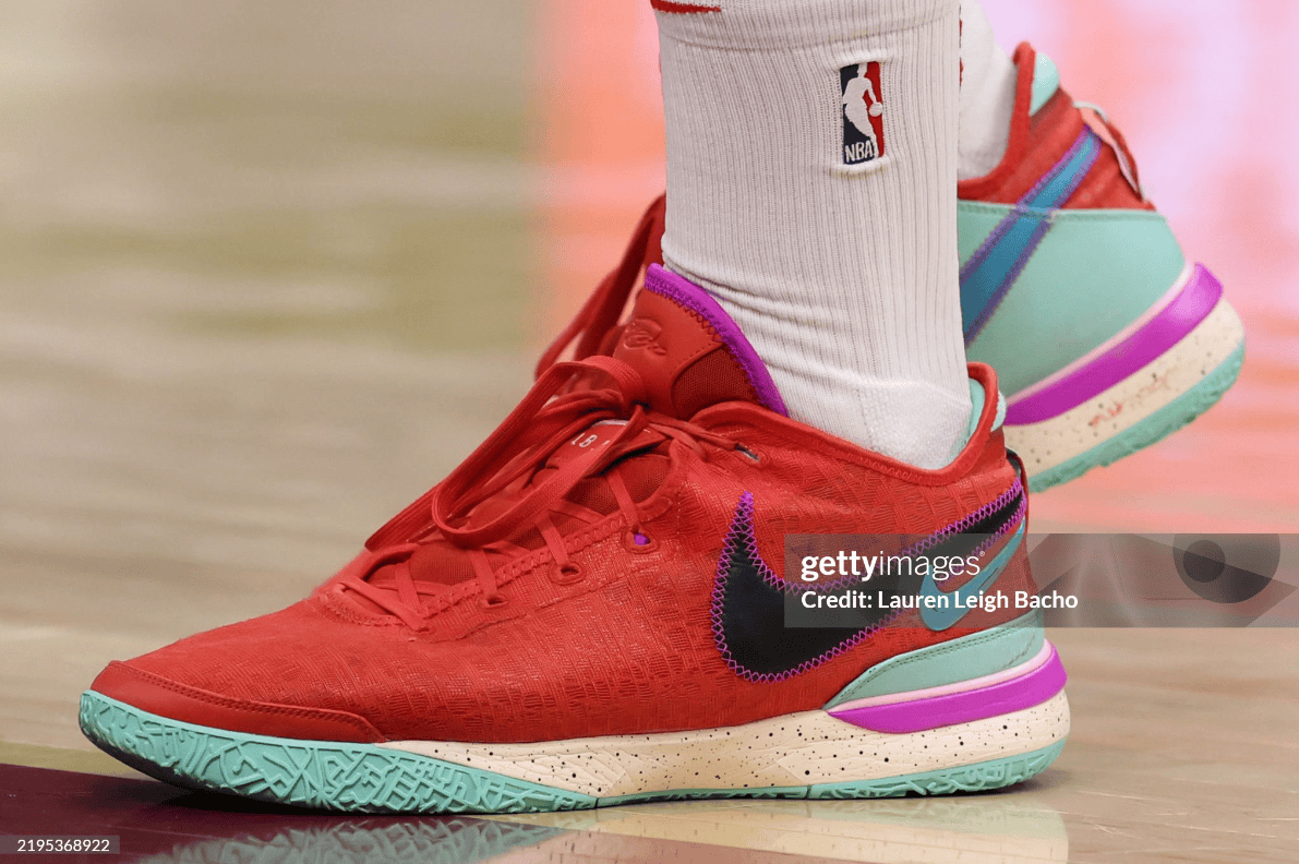 申京穿着西瓜红色Lebron NXXT Gen,得到13分13助攻