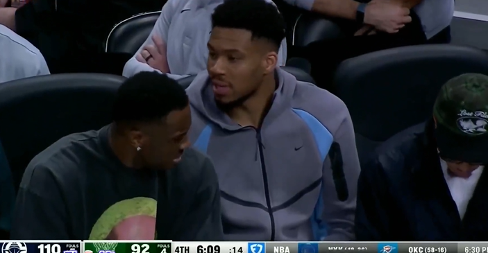 雄鹿末节落后快船20分,转播镜头给到替补席的字母哥