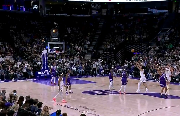格林迎着文班亚马长臂防守底角三分投进,勇士仅落后马刺5分