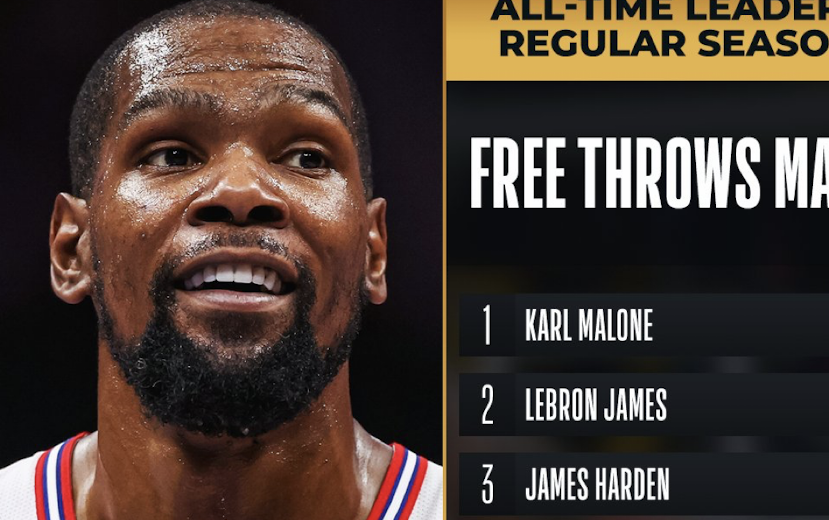 NBA官方:恭喜杜兰特,在NBA历史罚球命中数榜单上升至第6位