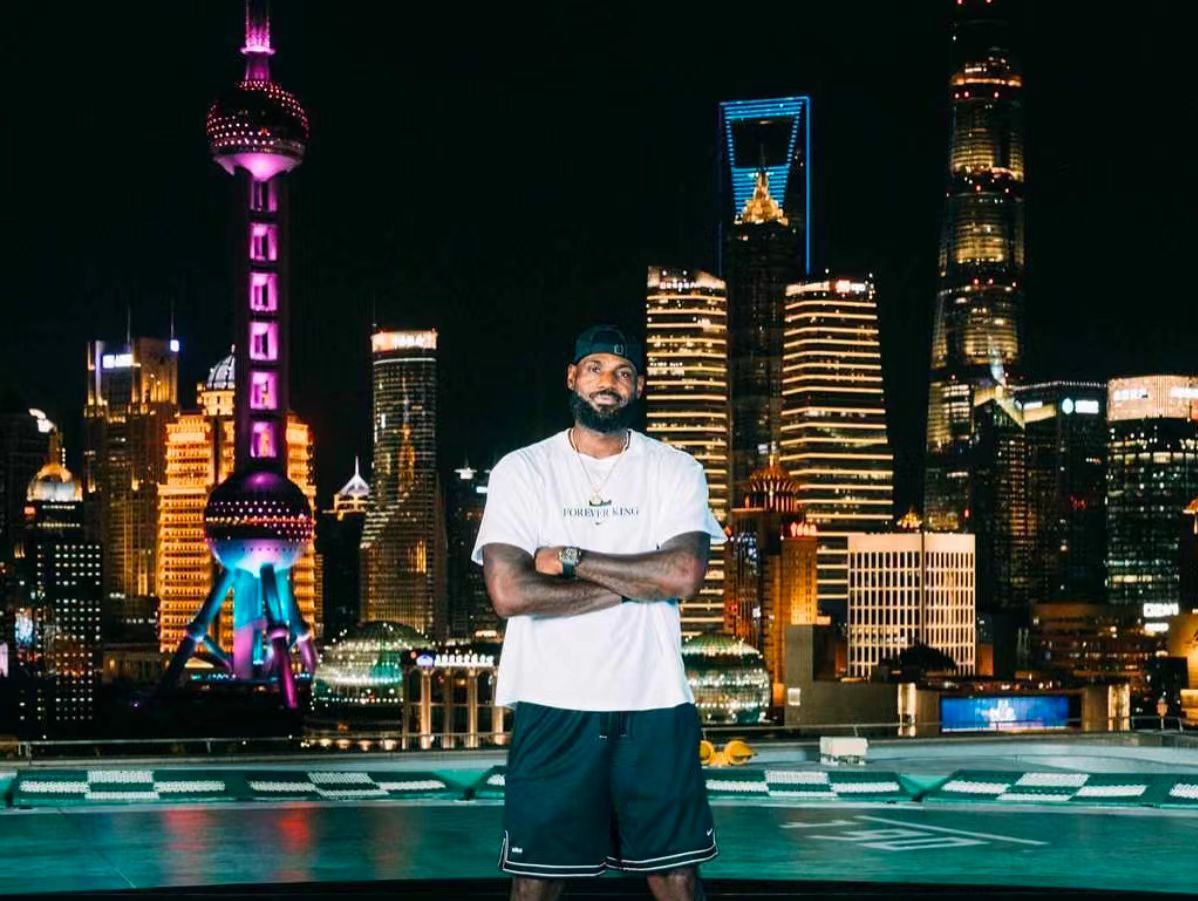 詹姆斯昨晚身着金色Lebron23在上海外滩建筑群前留下合影