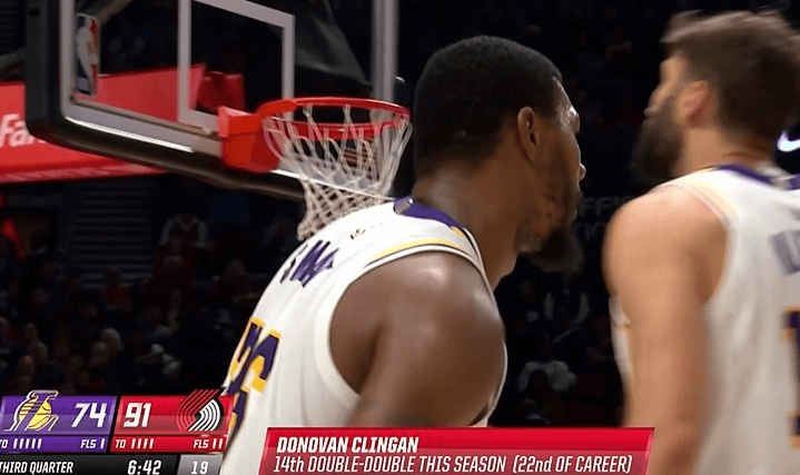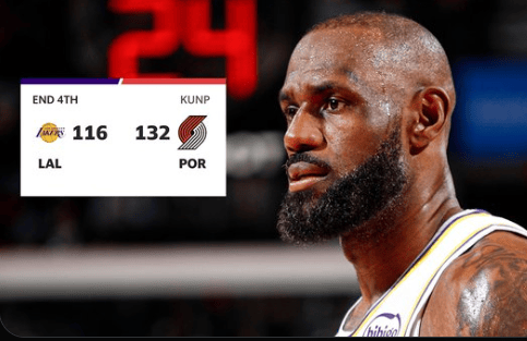 詹姆斯第三节最后一攻飞出场外倒地,随后缓缓起身