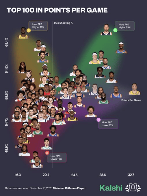 美媒公布得分榜前100球员的场均得分与真实命中率的象限图