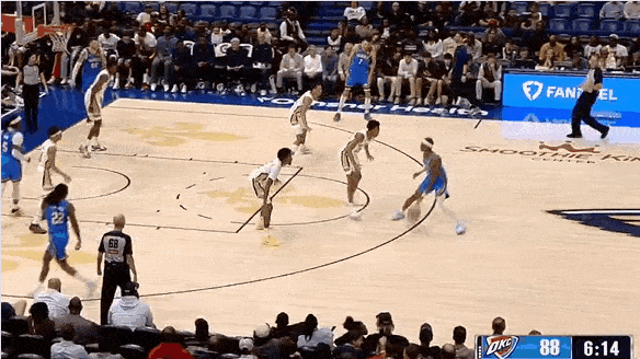 尚帕尼外线连续绕掩护,迎着伊迪防守干拔投进3+1