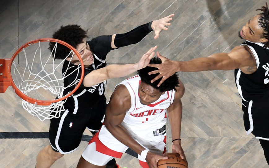 阿门顶着贴身防守上篮再进,火箭再次将分差拉开到11分
