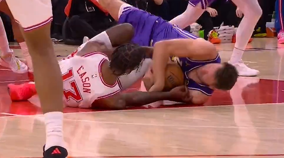 疑似受伤瞬间:特雷-约翰逊被断后欲反抢,将坎宁安压在身下