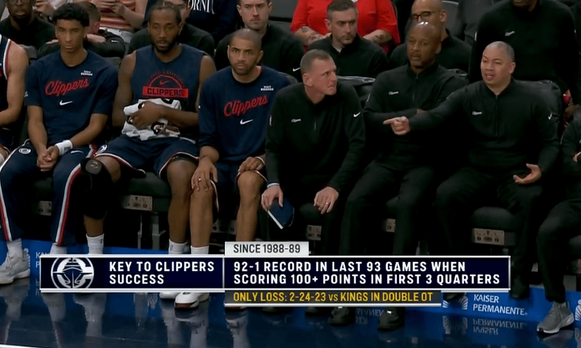 快船前三节过百时92胜1负,1负为23年双加时175-176不敌国王