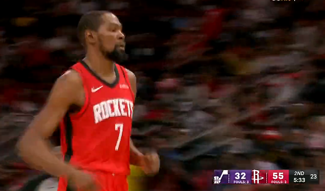 杜兰特目前6中6、三分2中2砍下15分,火箭领先爵士23分