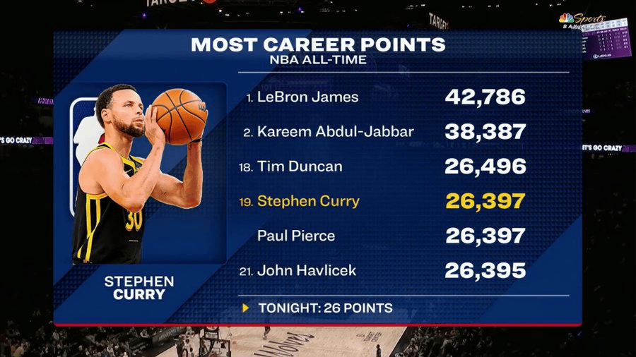 库里生涯总得分追平皮尔斯,距离历史第18位的邓肯还有99分