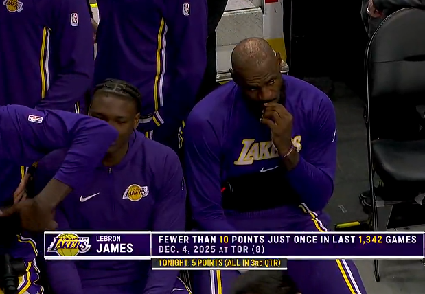 詹姆斯过去1342场仅1次得分不到10分,今日目前三节仅得5分