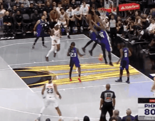 虎扑 21回复布克突击篮下上篮不中,马威旱地拔葱双手暴力补扣命中